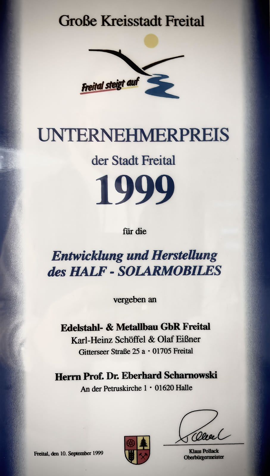 Für die „Entwicklung und Herstellung des HALF-Solarmobiles“ wurde die Edelstahl- & Metallbau GbR Schöffel & Eißner im Jahr 1999 mit dem Unternehmerpreis der Stadt Freital ausgezeichnet.